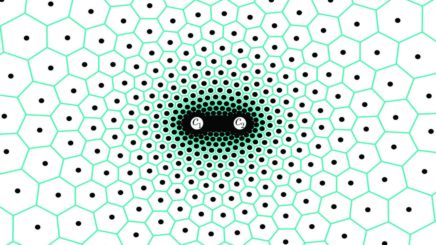 As another backbone network, maybe we’d like the points \(P\) to be close to a “distribution hub” located in the center \(c\) of the square. So we have to pay a cost of \(\phi\|p_{i}-c\|\) for each landmark point \(p_i\), and our problem looks like \[ \underset{P}{\textrm{minimize}}\mathcal{D}_{\mathrm{avg}}(P;\mathcal{S})+\phi\sum_{i=1}^{n}\|p_{i}-c\|. \] The optimal solution takes the form shown in Figure 1c, called the “contracted honeycomb.” The density of landmark points is proportional to the distance to \(c\) raised to the power of −2/3.