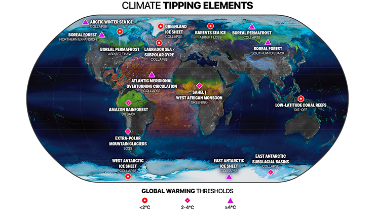 Some thresholds within the donut framework do appear to manifest as tipping points, especially those that pertain to climate and ecosystem changes [3, 8]. However, researchers do not yet know whether thresholds for other planetary boundaries or social foundations manifest as tipping points; this is still an active area of research in sustainability science [5, 12]. Nonlinear feedback, abruptness, multiple stable states, and limited reversibility of changes must be present for tipping points to occur [11].