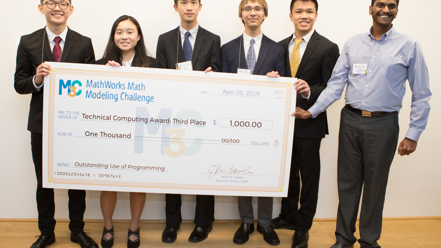 Chai and Hansen—along with teammates Emily Jiang, Kyle Lui, and Jason Yan—will split $20,000 in scholarship funds for their first-place finish. The group also received the third-place M3 Challenge Technical Computing Scholarship Award, which yields an additional $1,000. Instituted in 2018 under the MathWorks title sponsorship, this prize is awarded for “outstanding use of programming to analyze, design, and conceive a solution for the problem” and allocates a total of $6,000 to three high-performing teams.