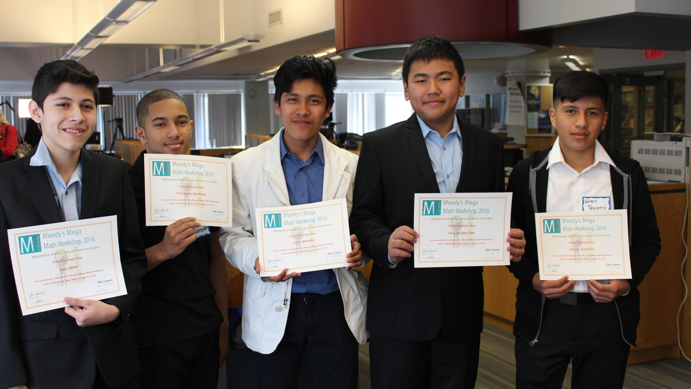 The workshop concluded with awards of $1,000 each in college scholarships to three random winners. The recipients, Naiomy Rangel of the High School of Economics and Finance, Maurice Avery Jr. of Marta Valle High School, and Chelsea Vicente of Queens Vocational and Technical High School, were also recognized at the Moody’s Mega Math Challenge awards reception at Moody’s Corporation headquarters and treated to a trip to the New York Stock Exchange to witness the Closing Bell ceremony.