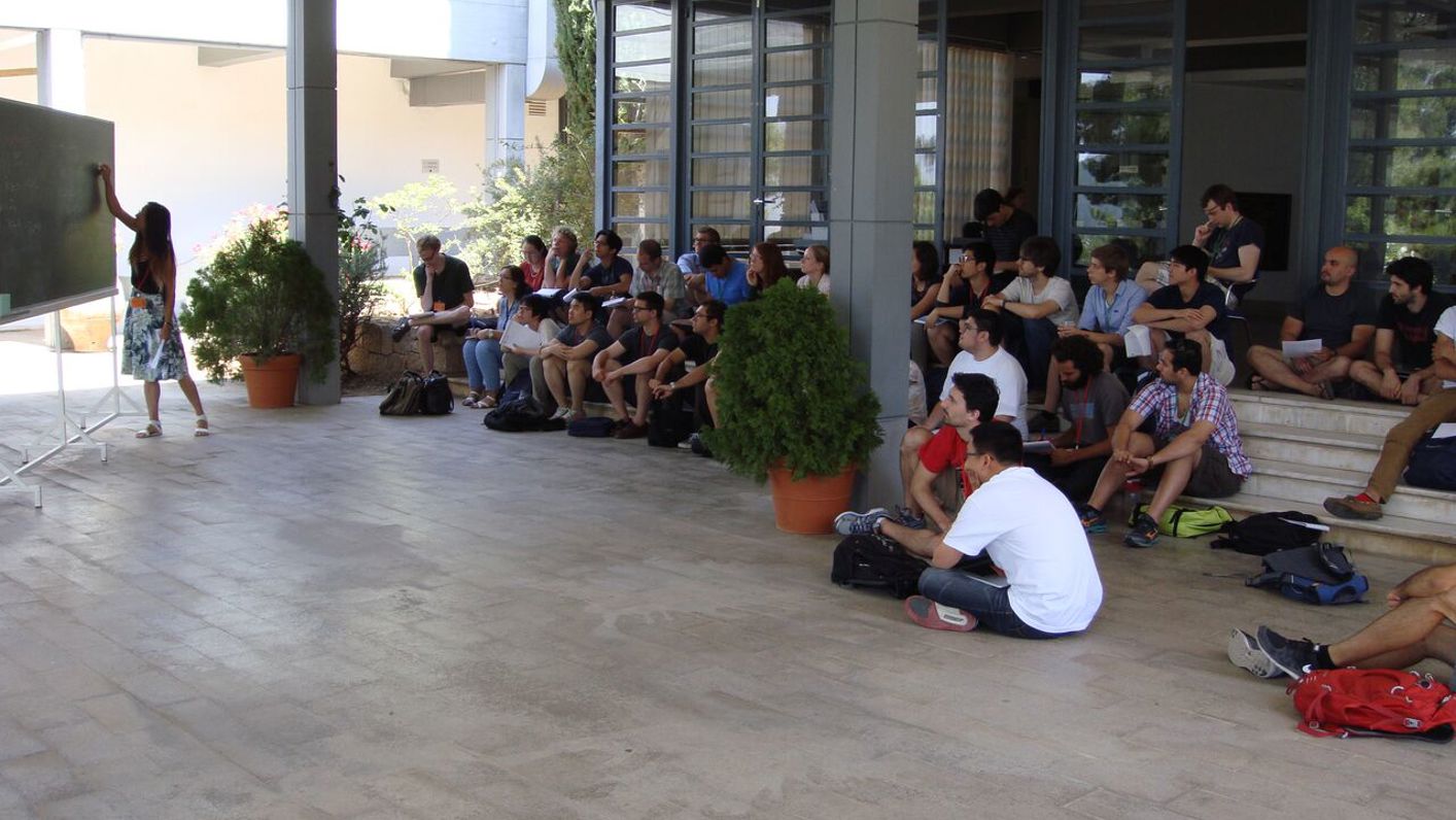 The school was organized around talks on the following themes in RandNLA: sampling, numerical aspects, statistical and optimization aspects, random projections, and linear algebra and MATLAB tools. Many of the participants commented favorably on the opportunity to socialize and network with their peers and the instructors, an integral component of all G2S3s. Students participated in an open problems session and also presented their ongoing or planned research (sometimes outdoors, profiting from the art-filled yards and the breathtaking view of the valley at Delphi). Eugenia Kontopoulou demonstrated the RandNLA GUI for the TMG MATLAB toolbox built at the University of Patras.
