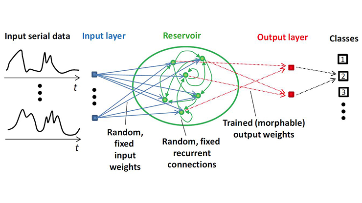 A reservoir computer is a recurrent artificial neural network for processing time-dependent information.